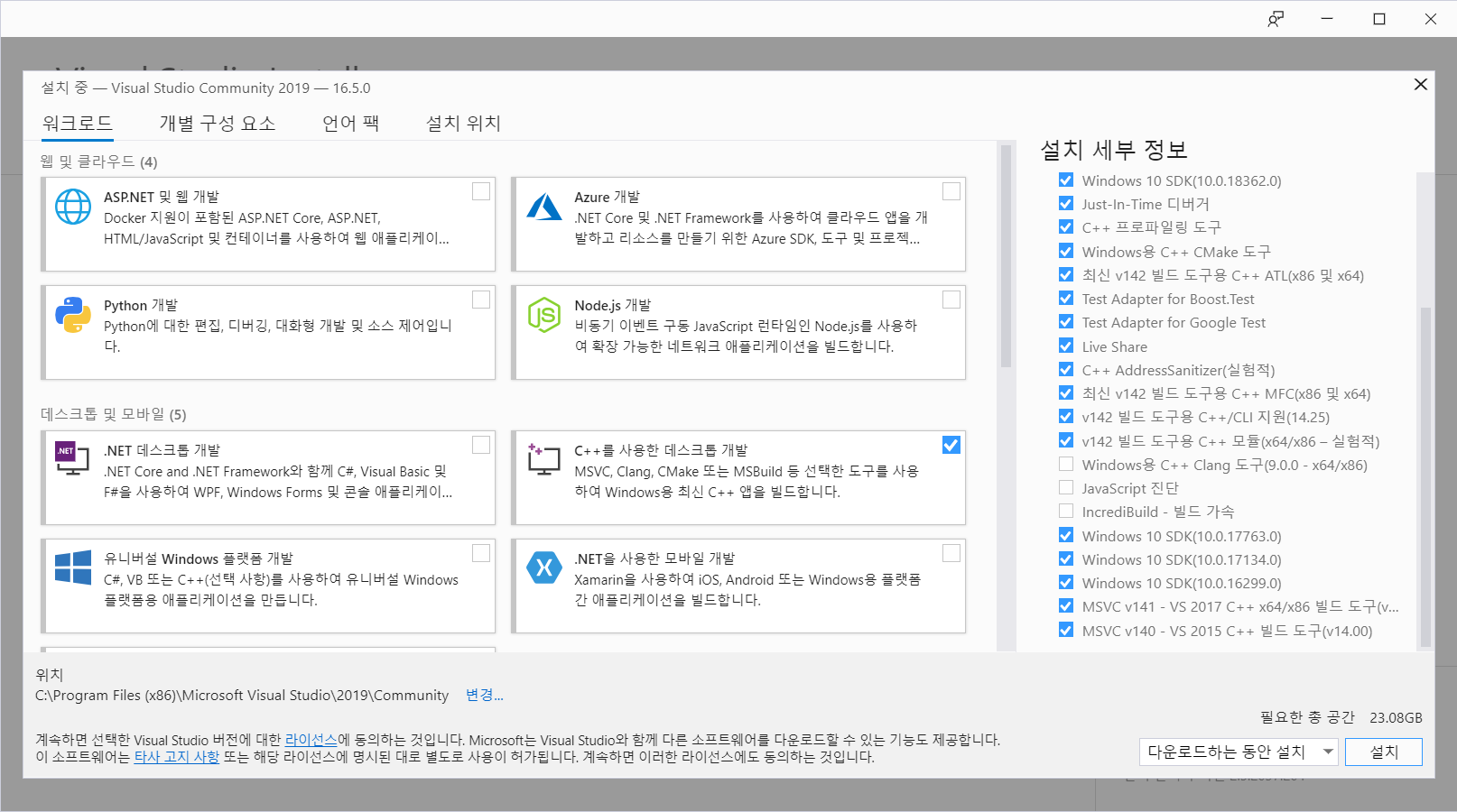 - 설치 세부 정보에 있는 목록에 항목들이 뭔말인지 모르겠으면 일단 체크하시는 것을 추천드려요. 기본 팩으로만 깔았다가 설명과는 다르게 컴파일이 안되는 경우가 발생할 수 있습니다.